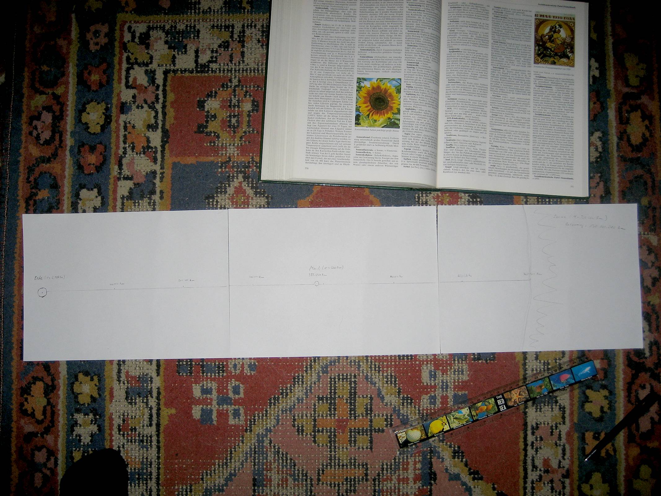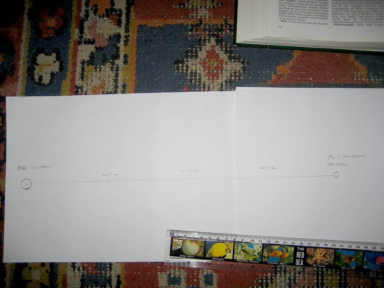 Wiedergabe des Abstandes zwischen Erde und Mond: Obwohl die Erde recht klein im linken Eck eingezeichnet ist, genügt ein einzelnes DIN A4-Blatt nicht, um darauf auch noch den Mond platzieren zu können. Es musste ein weiteres Blatt angelegt werden