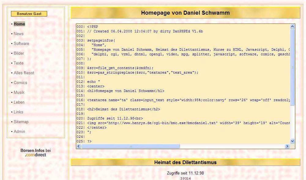 Die alte Homepage: In der Textarea wird der Sourcecode der eigenen Seite angezeigt